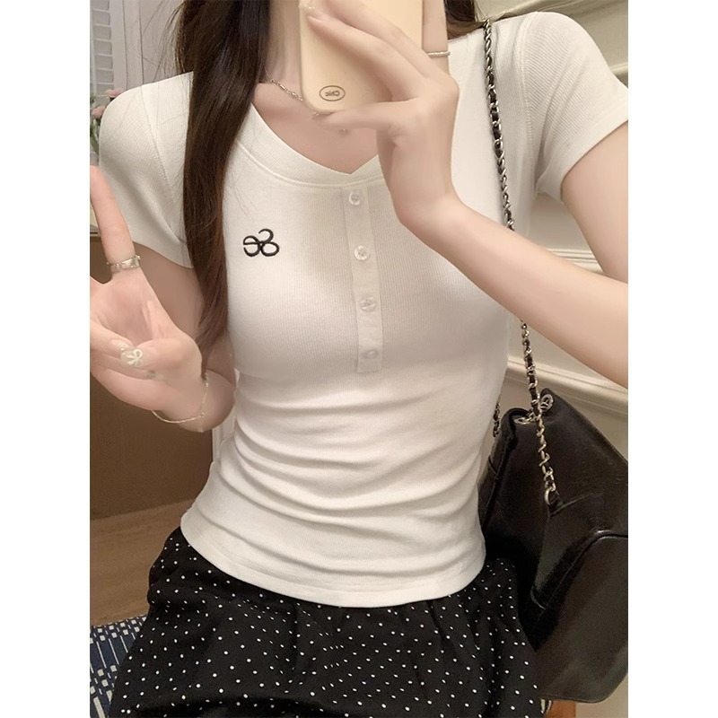 2024純欲半開襟ボタン正肩半袖tシャツ女性bmギャルねじ腰がやせて見える夏の上着