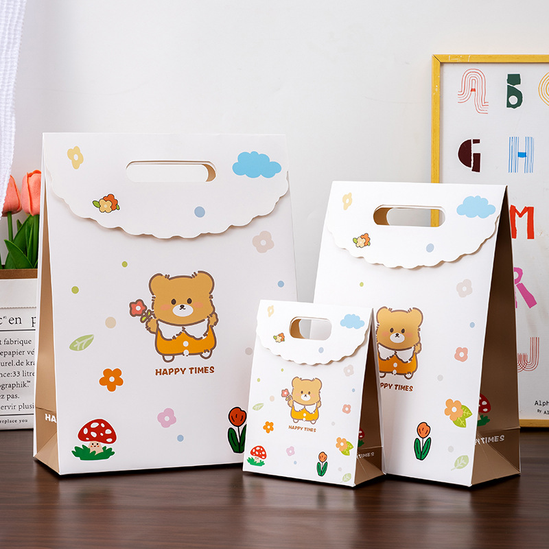 かわいい漫画の熊はプレゼントの手提げ袋をかぶせて子供の日の幼稚園の活動の紙袋の誕生日プレゼントの包装袋を開きます。