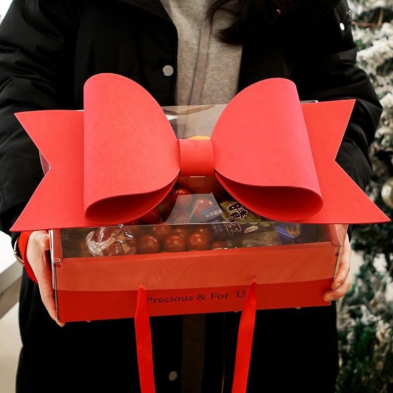 透明なバレンタインデーのケーキのギフトボックスの果物の包装箱の母の日の花のギフトボックスのネットの赤い蝶結びの手提げの花の箱