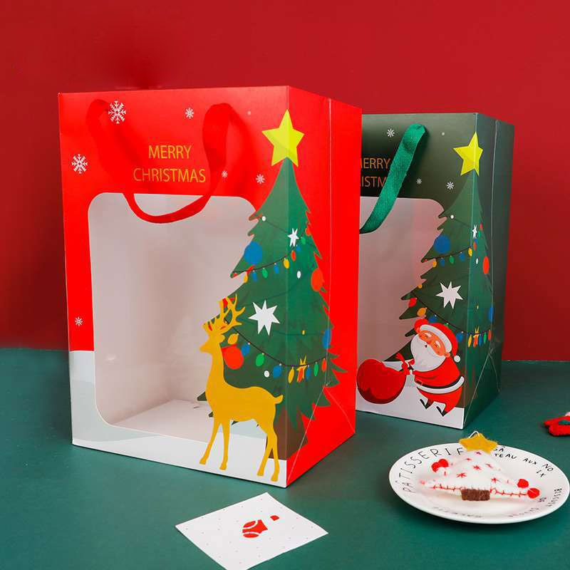 クリスマスのショーウインドーの袋のクリスマスイブのリンゴの贈り物の袋の子供の新鮮な花束の贈り物の包装の手提げ袋は窓を開けて透明です。