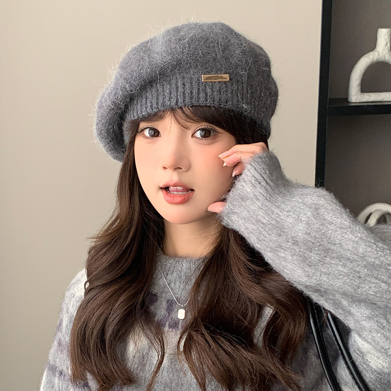 ウサギの毛のベレー帽の女性の秋冬の韓系の百合の灰色の画家の帽子の復古の鉄の標識は顔の小さい毛糸のつぼみの帽子を現します。