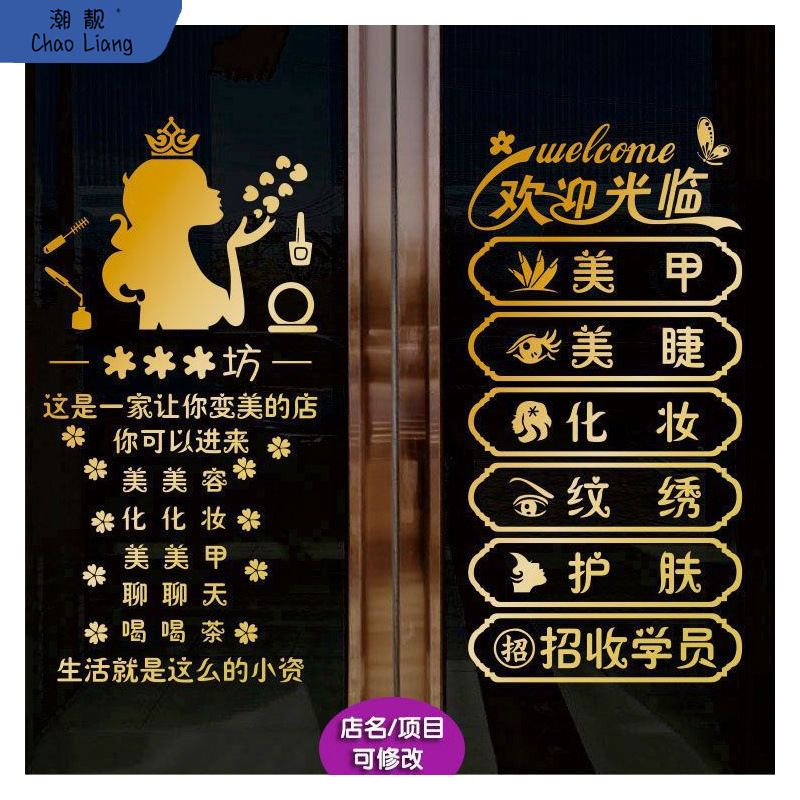 容院甲の目前の養生店は字の店舗のガラスの扉のシールを貼ってショーウインドーの扉の上のプロジェクトを貼って郵送します。