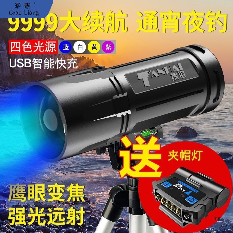 夜の釣り灯の強い光の釣り灯の紫の光の台の釣りの明るい魚の明かりの大出力は餌を引っ張ります充電する青い光の懐中電灯の夜の新商品です。