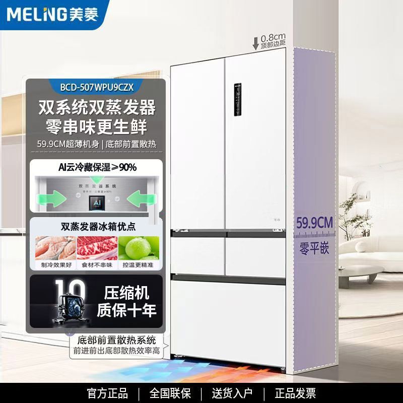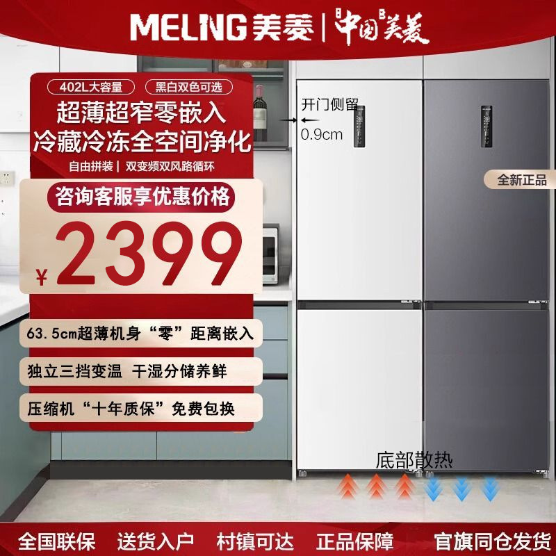 美菱400リットルフランス式小戸型家庭用底部放熱超薄型埋め込み型一級ダブルインバータ空冷冷蔵庫