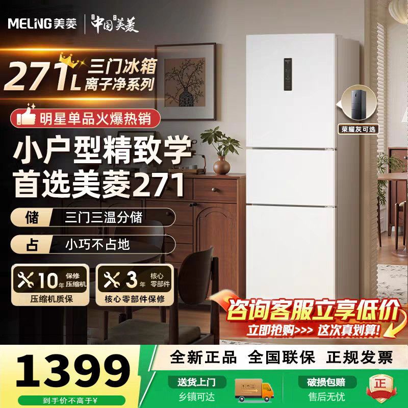美菱冷蔵庫271リットル三門家庭用インバータ小戸型寮賃貸風冷無霜三温冷蔵庫