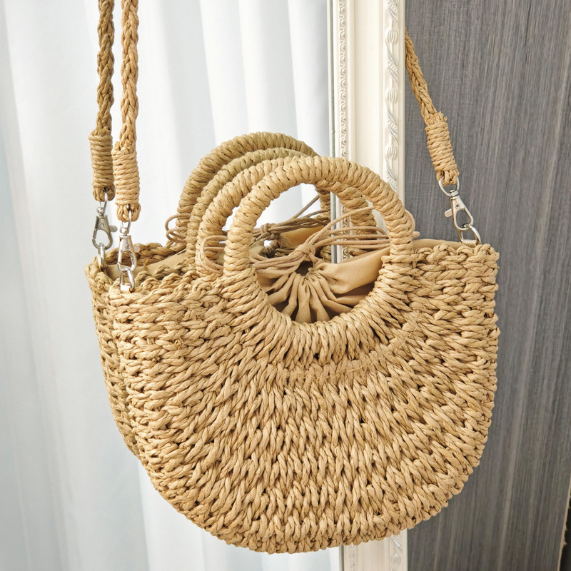 ラウンドビーンバッグ織りバッグ、手織りバッグ、カジュアルハンドバッグ、ビーチバッグ、半円形ショルダーバッグ