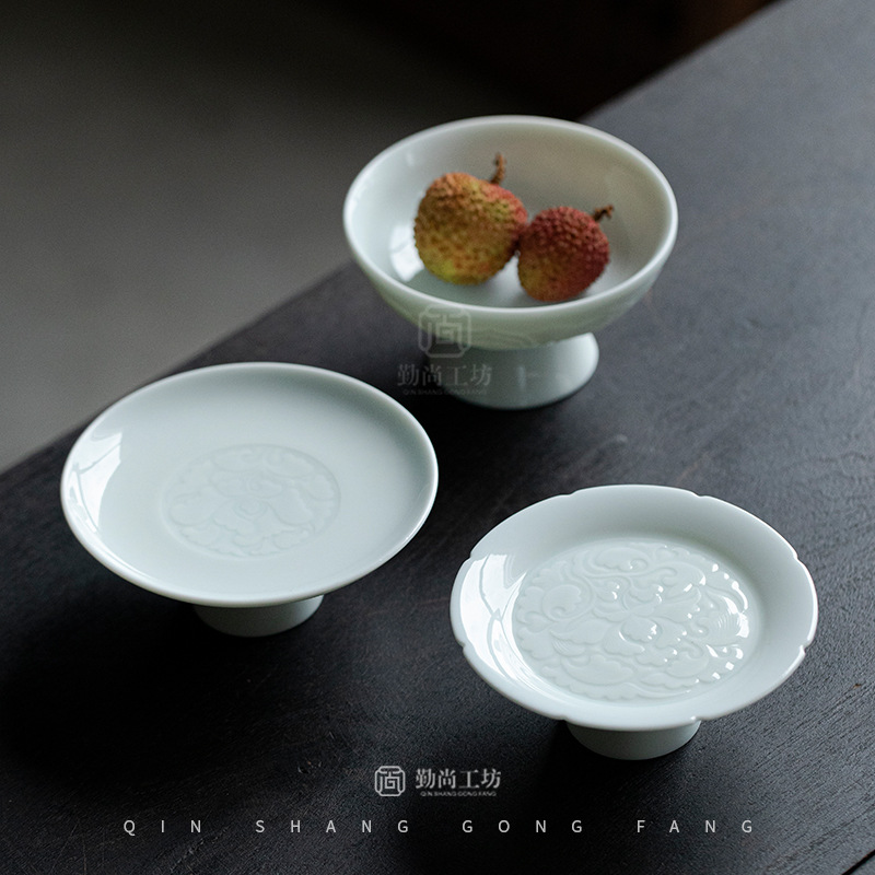 手作りレリーフシャドウグリーンセラミック背の高いフルーツプレート禅茶室茶菓子プレートドライフルーツプレート中国茶道アクセサリーポットホルダー