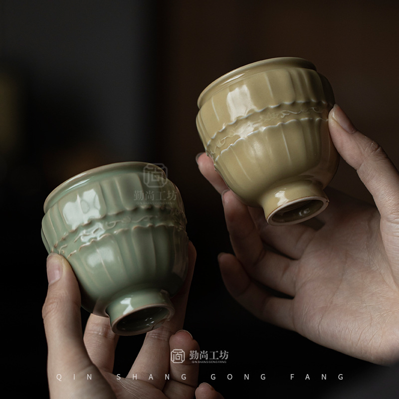 越窯青磁手彫り蓮マスターカップティーカップ大型セラミックカンフーティーセットティーカップシングルカップ