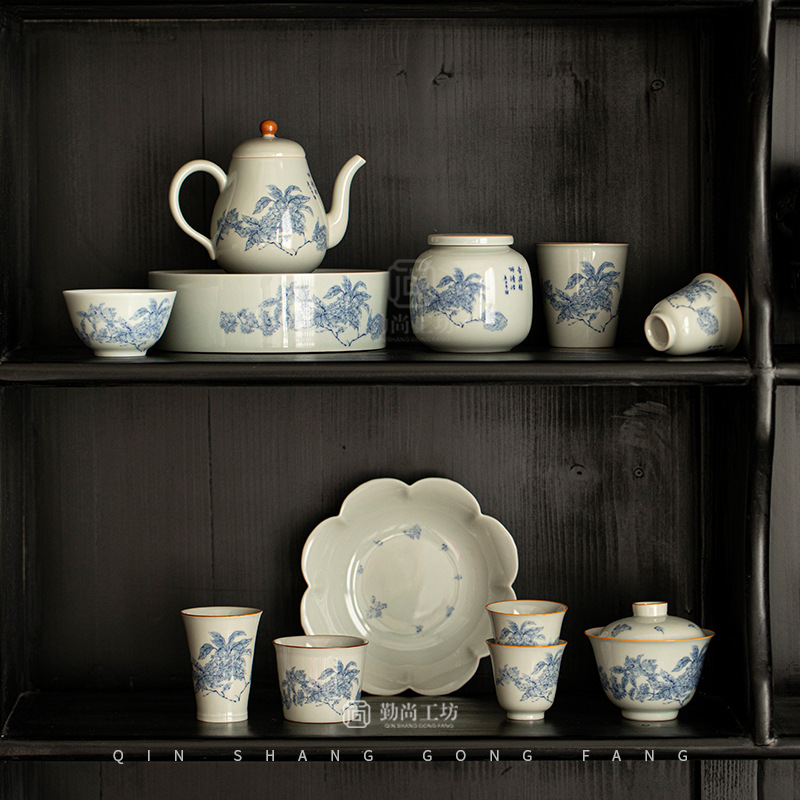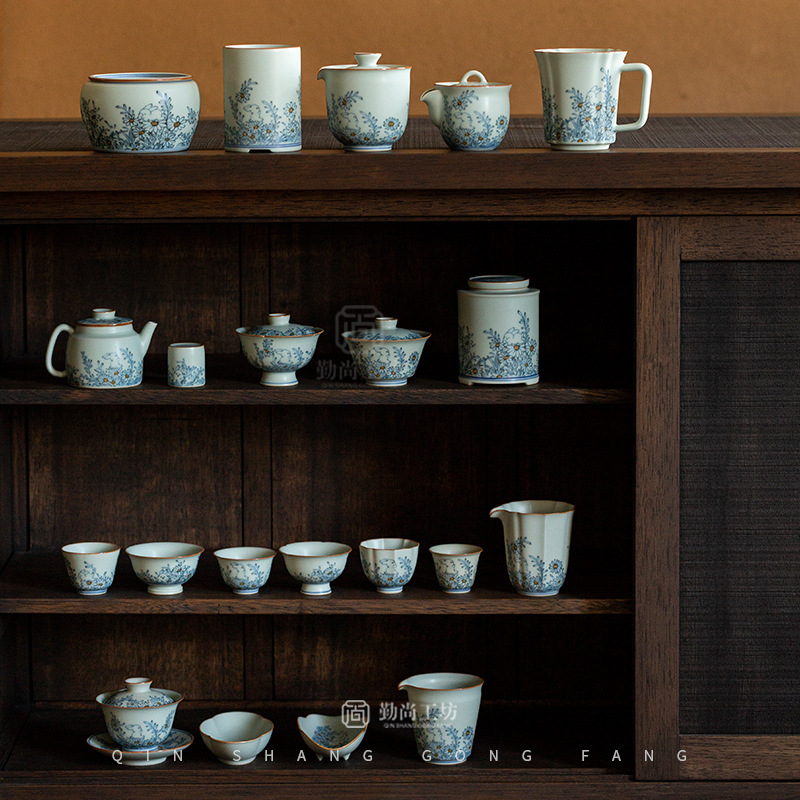 アンティーク青と白の Ru 窯野生菊ウサギ Ercai カバーボウルティーポット家庭用セラミックカンフーティーセットフェアカップティーカップ