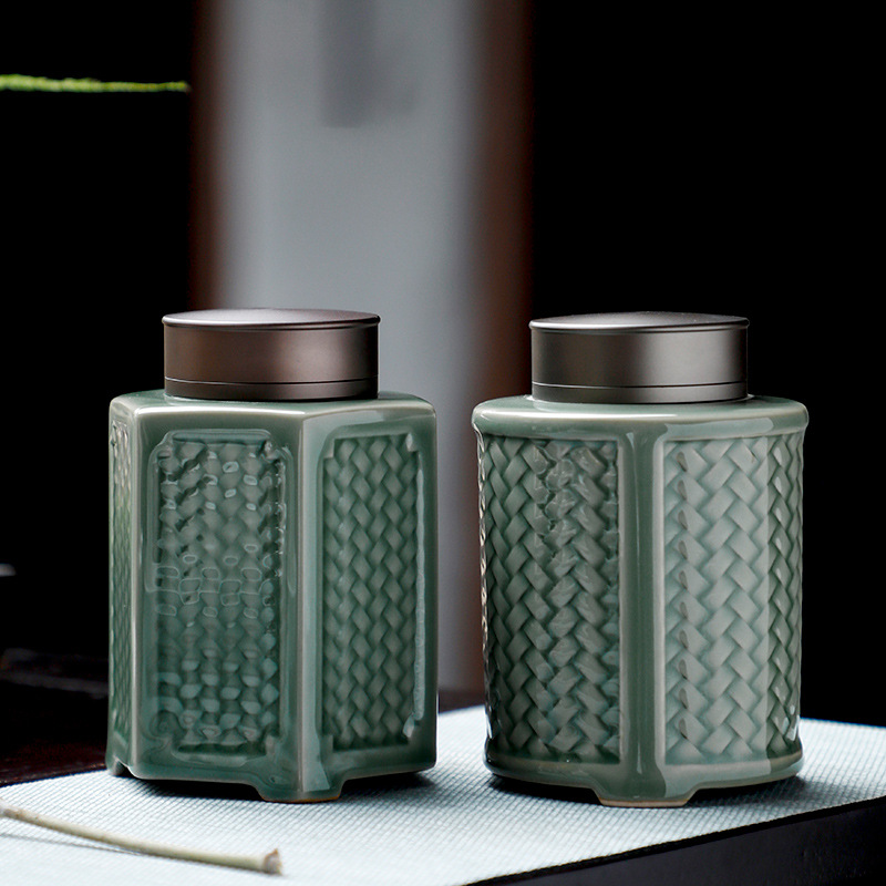 越窯青磁藤編茶葉缶陶磁器家庭用密封缶二重錫蓋保存茶缶中国式茶葉包装缶