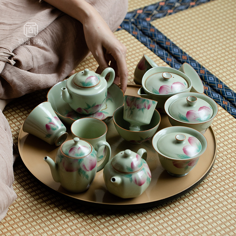 秘黄汝窯粉彩寿桃単一陶磁器蓋碗ティーポットカップセット家庭用レトロ女性工夫茶器
