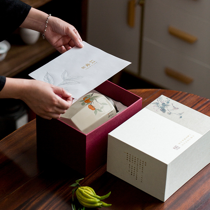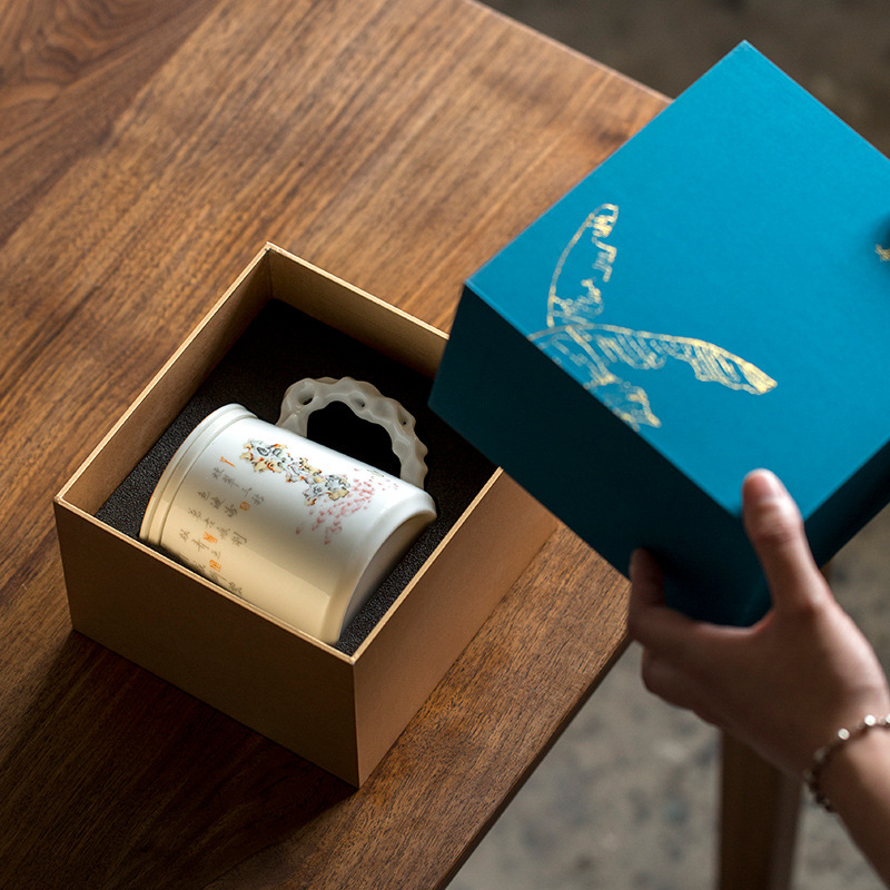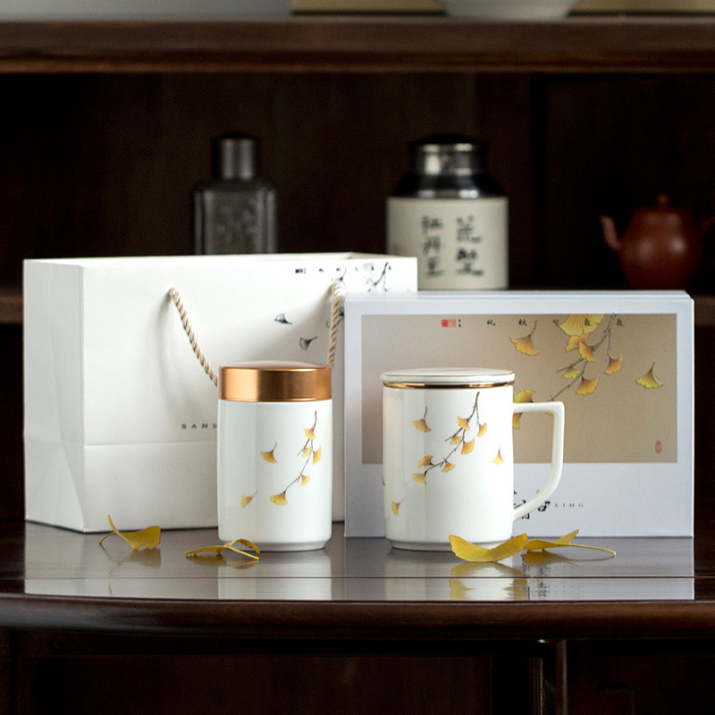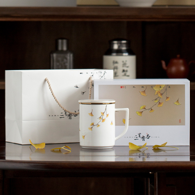 三生は杏の事務カップがあります。白磁のギフトボックスに陶磁器のお茶を入れます。