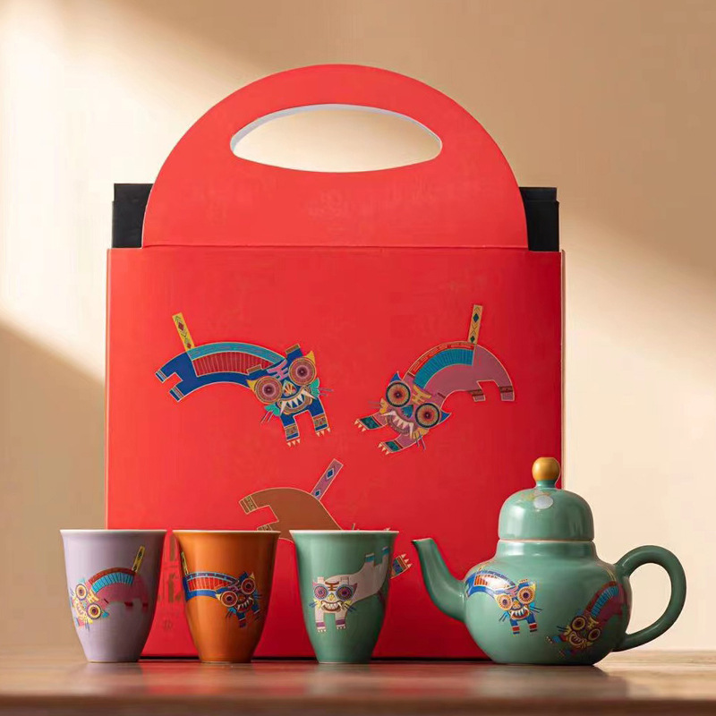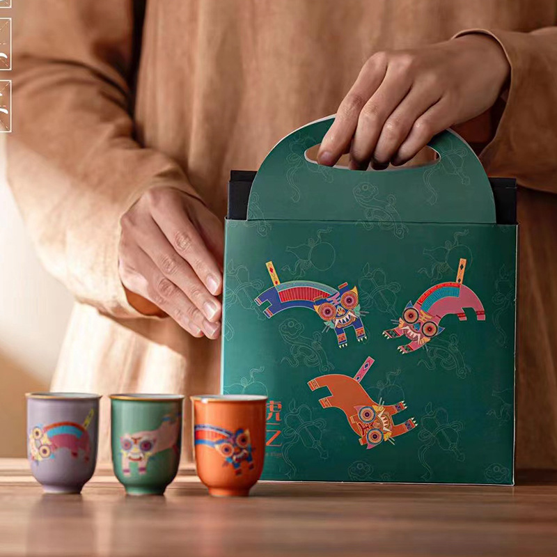 中国式の寅虎年は虎のように翼を添えて小さい贈り物の箱の陶磁器の3杯は工夫の茶道具のお茶を詰めます。