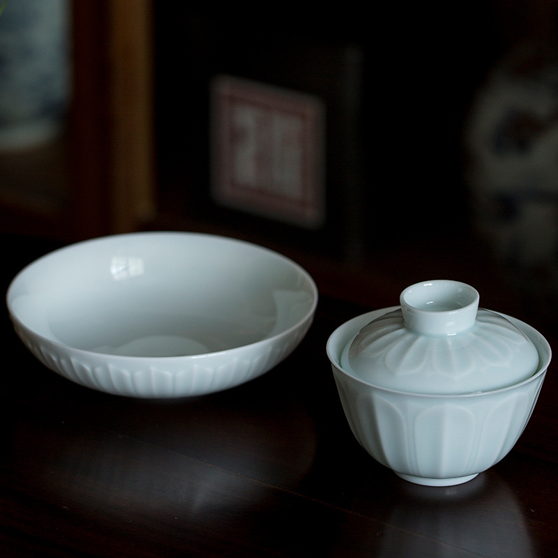 青白い磁器は宋の工夫茶器セットの家庭用陶磁器の三才蓋碗の手作り茶器をまねて茶わんを入れます。