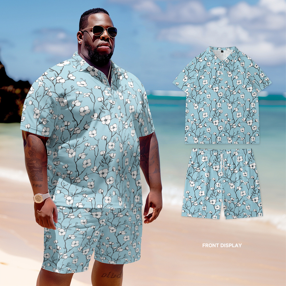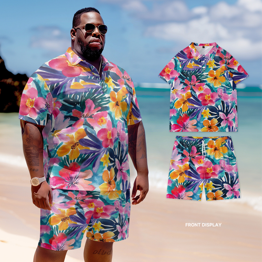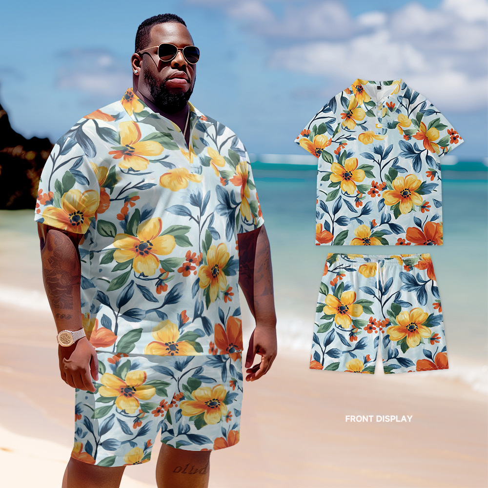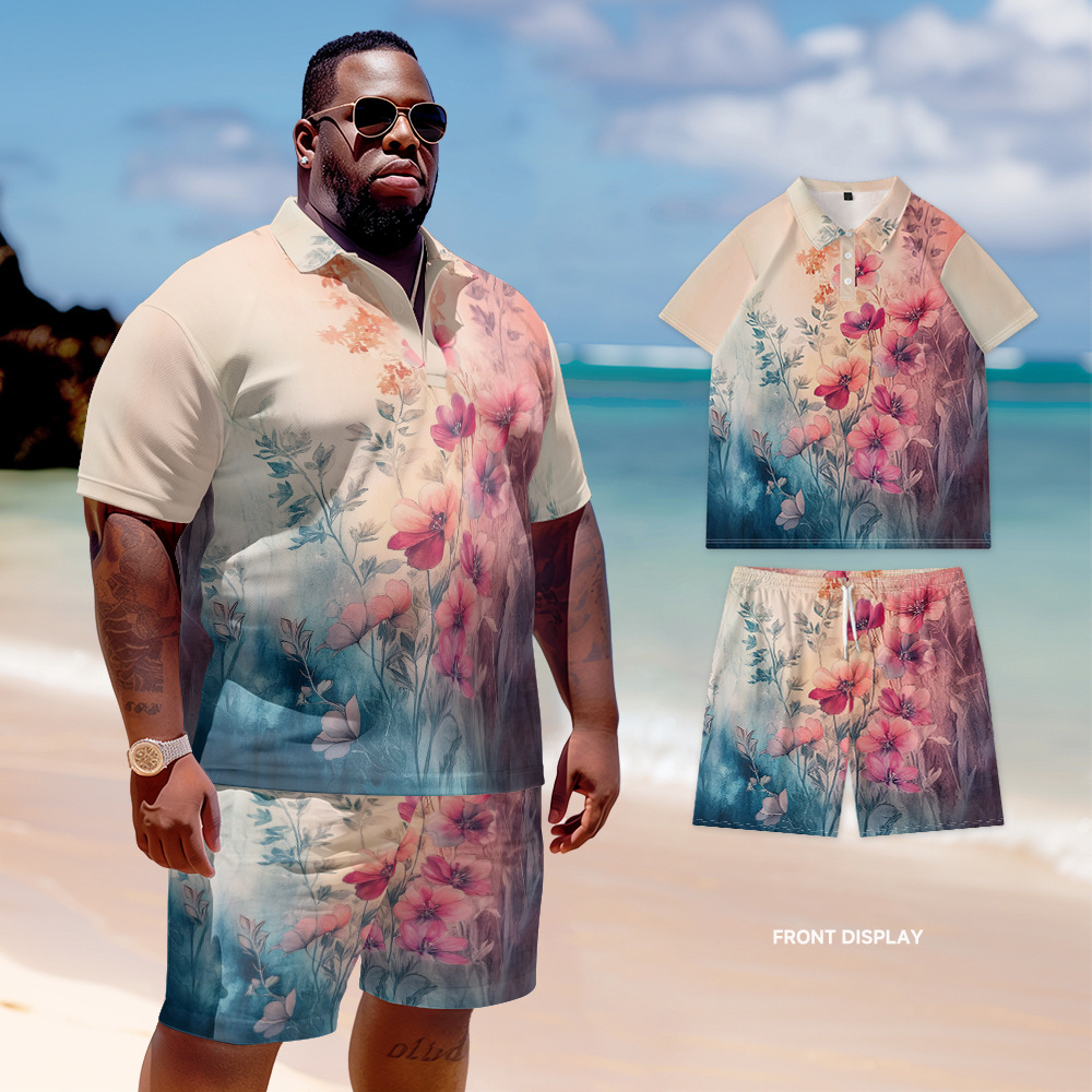 新型欧米風poloシャツセットのゆったりとしたカジュアルな大きいサイズの紳士服半ズボンの半袖の花がいっぱいになっています。