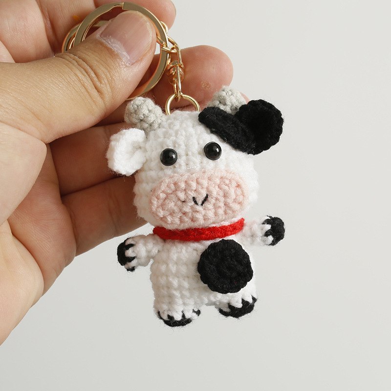 クリエイティブな手作りのかぎ針編みの牛の小さな人形、かわいい4本の毛糸で編まれた牛のペンダント、手作りの動物バッグの吊り下げ完成品
