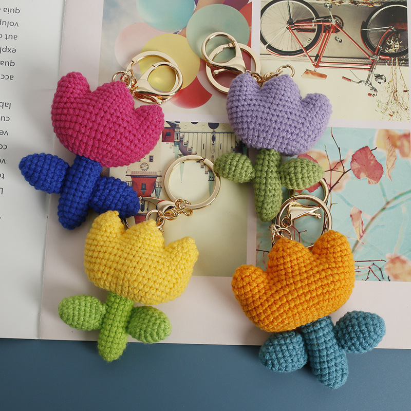 手編みのチューリップの掛け物の宝のお母さんの毛糸のかぎ針はキーホルダーを編んで花を包んで飾ります。