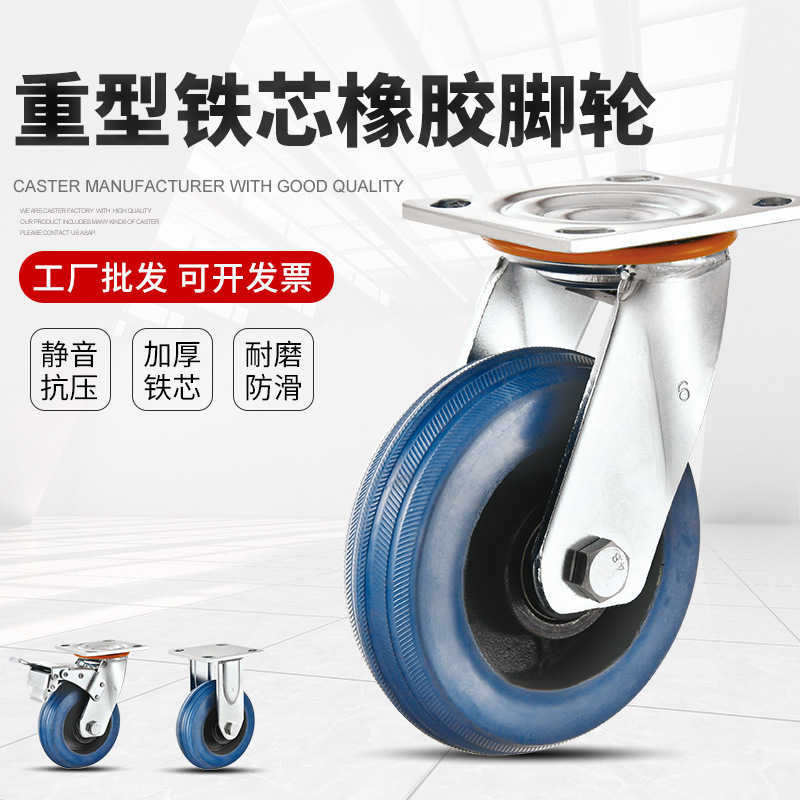 重型鉄芯ゴムキャスター4/5/6/8インチ静音ユニバーサルホイール弾力滑り止めブルー耐摩耗カートホイール