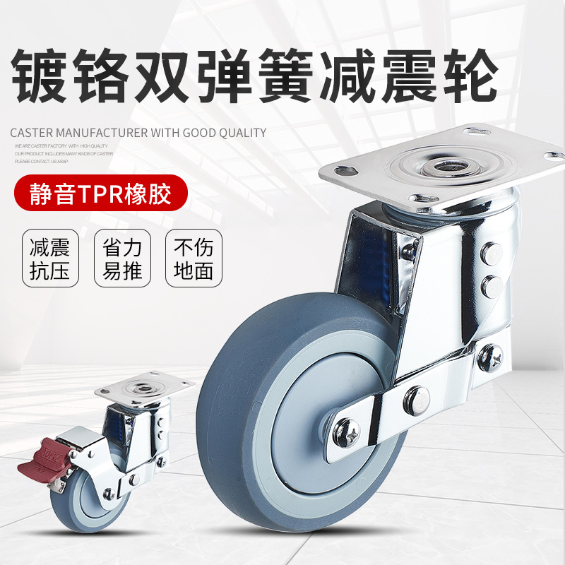 3インチ4インチ5インチクロムメッキダンパーキャスターtprユニバーサルホイールダブルスプリング静音ホイールブレーキ付きダンパーホイール