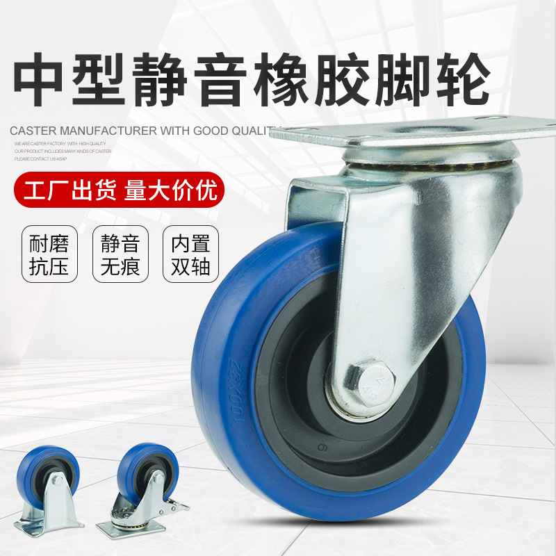 工業中型キャスター3インチ静音自在車輪ブルーゴム4インチカート中実板車ブレーキ付き単輪
