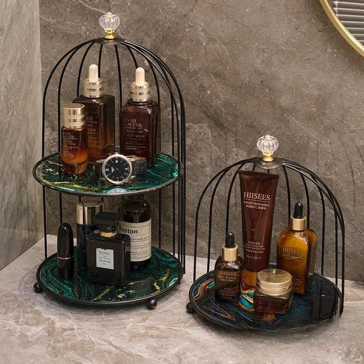 軽くて豪華な浴室のトイレの洗面台の収納棚の二重の洗面台の化粧台のデスクの化粧品の鳥かごの置物の棚