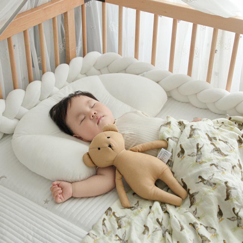 韓国の熊の新生児の赤ちゃんは寝てウサギの人形をかじって子供のぬいぐるみのおもちゃをなだめます。