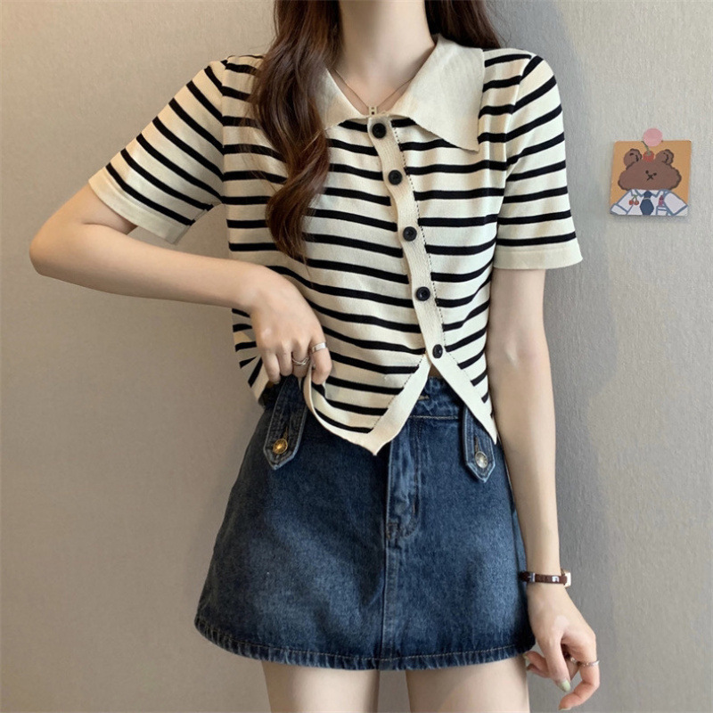 ストライプPOLO襟ニット半袖tシャツ女性夏の新しい肩のデザイン感が小さい