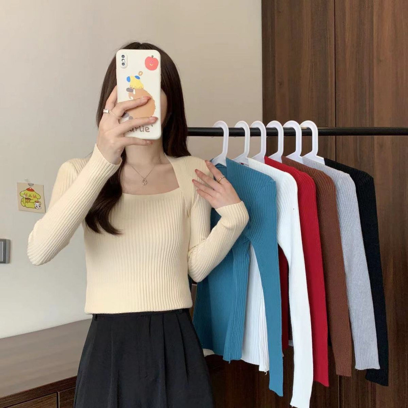 偽の2つの長袖のニットの秋冬の新型のセーターの女性の黒色の中は底のシャツを掛けて身を修めてやせている鎖骨の上着を現します。