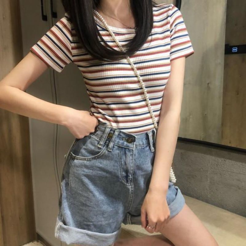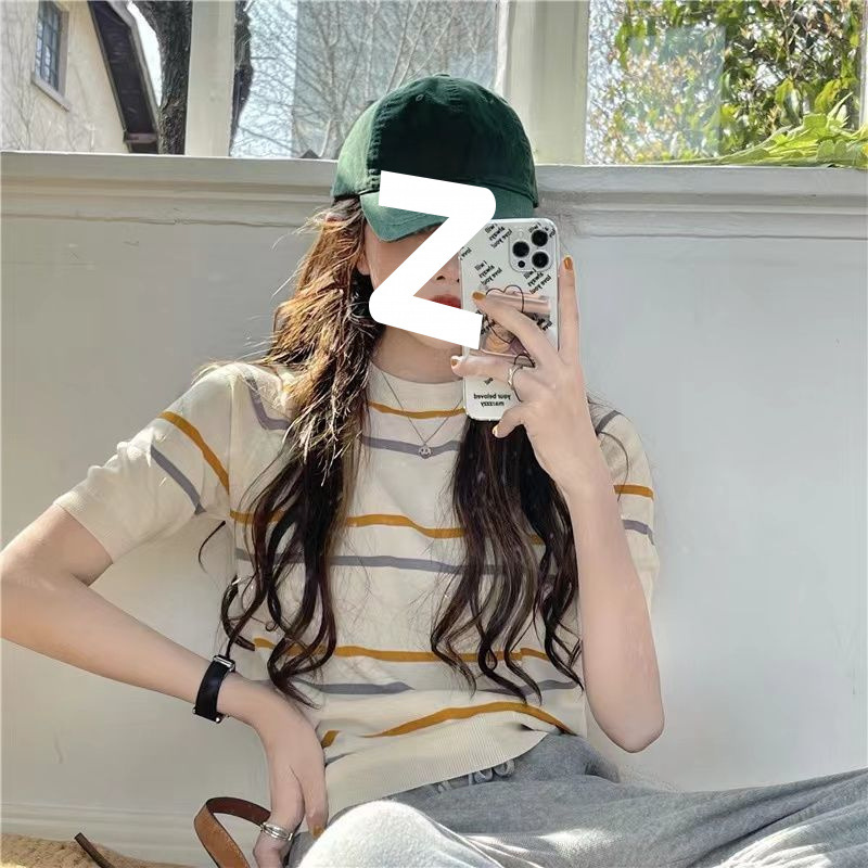2024新型氷糸縞半袖tシャツ女性ネット赤ins潮修身がやせて見える短いニットシャツの上着