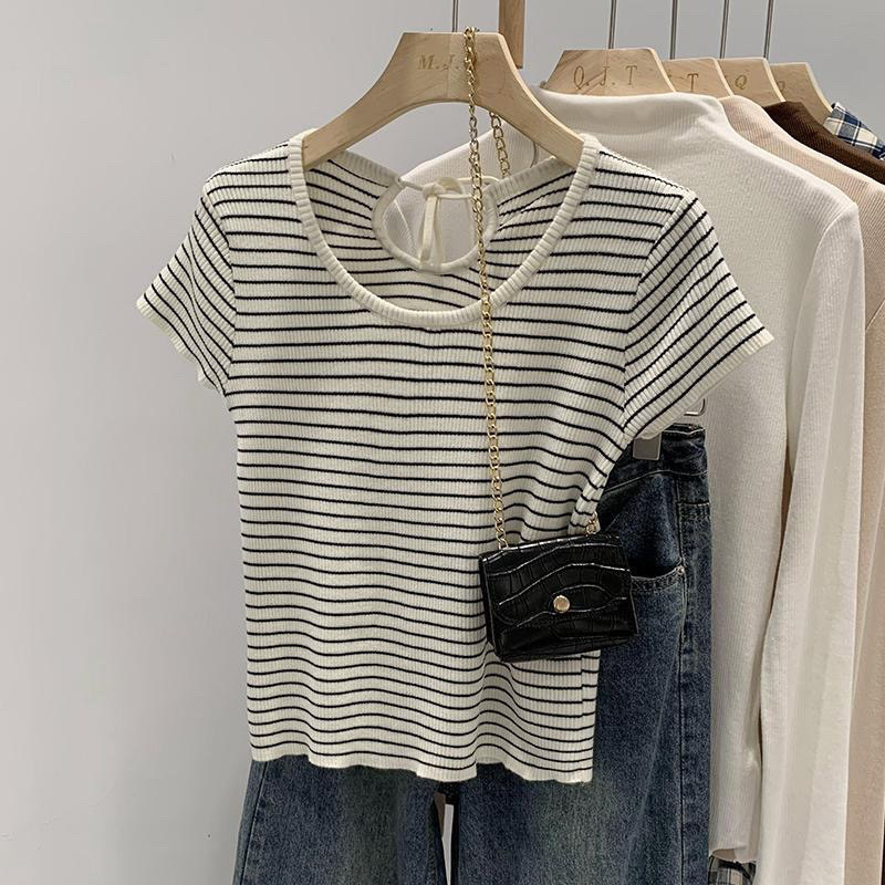 レトロなストライプの丸首の短いニットtシャツ女性の夏の新しいストラップのデザイン感のある半袖の上着