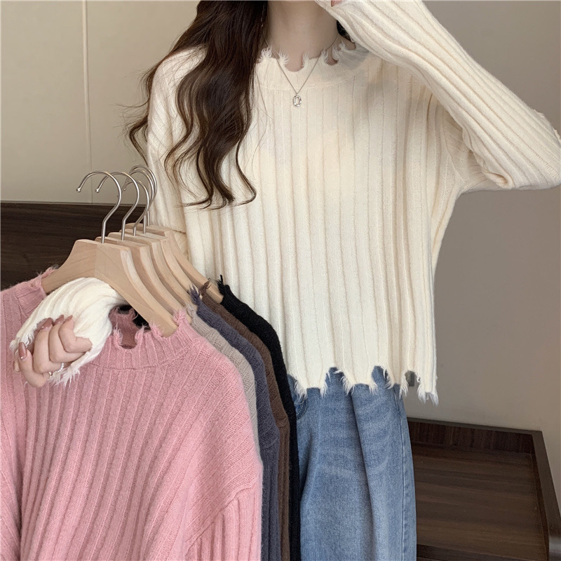 日本系レトロな不規則な毛の縁のデザイン感のニットのセーターの女性の2024秋冬の新型の怠惰な風の高級感