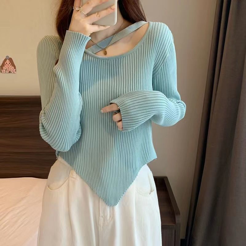 純粋な欲の長袖のニットの女性の秋冬の2024の新型の修身はやせている不規則な底のシャツのセーターの中で上着を掛けます。