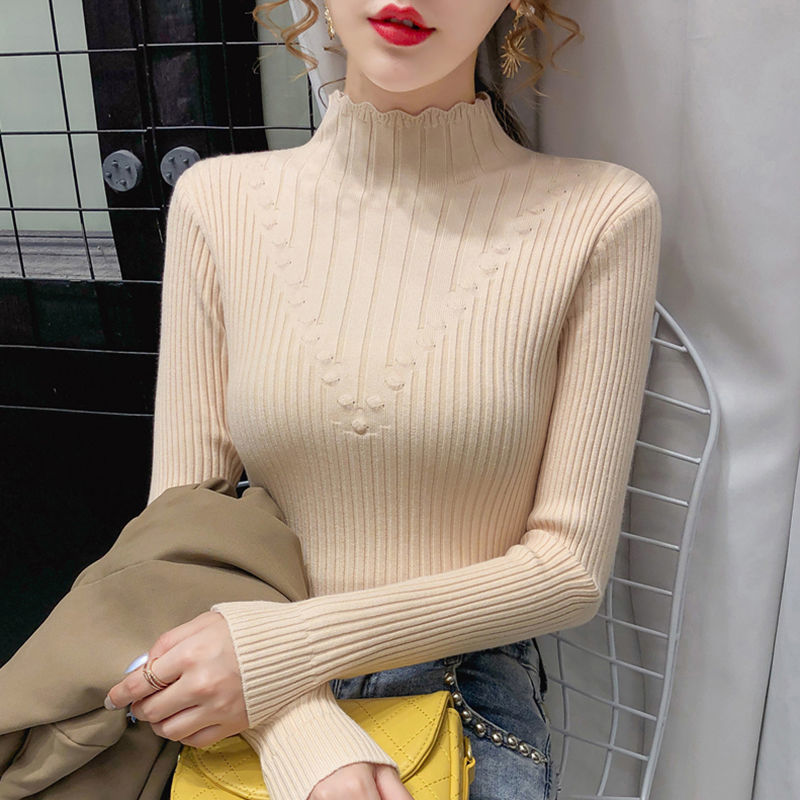半高襟のセーターの女性の底のシャツの中に2023年秋冬の新型の洋気の上着のハスの葉の辺の修身のニットの服を掛けます。
