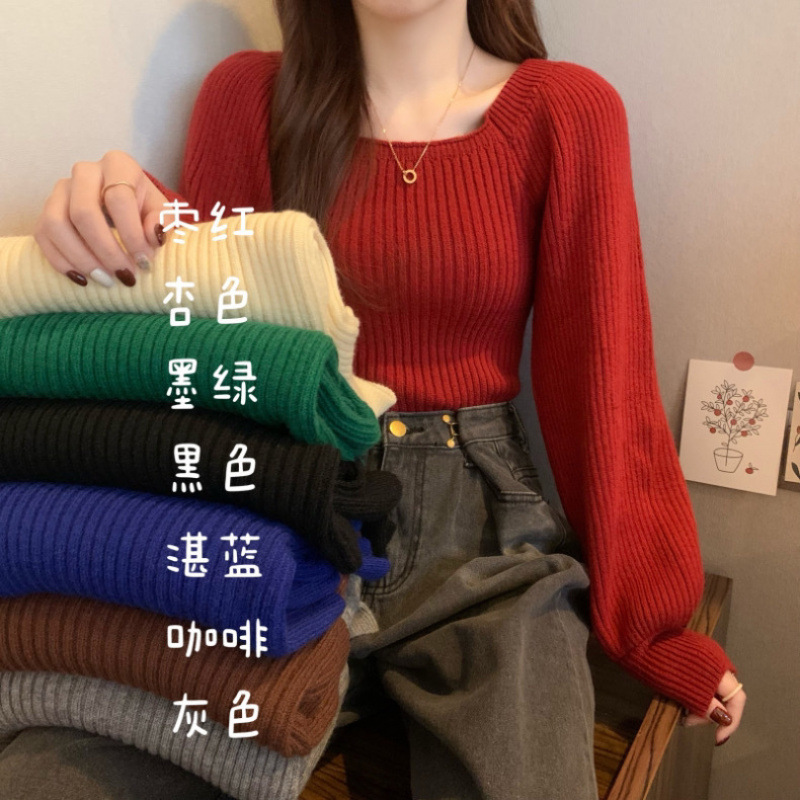 フランスの方襟の赤いセーターの女性の洋気の中に秋冬の新型のニットの底のシャツのデザイン感の小さい大衆の泡の袖を掛けます。