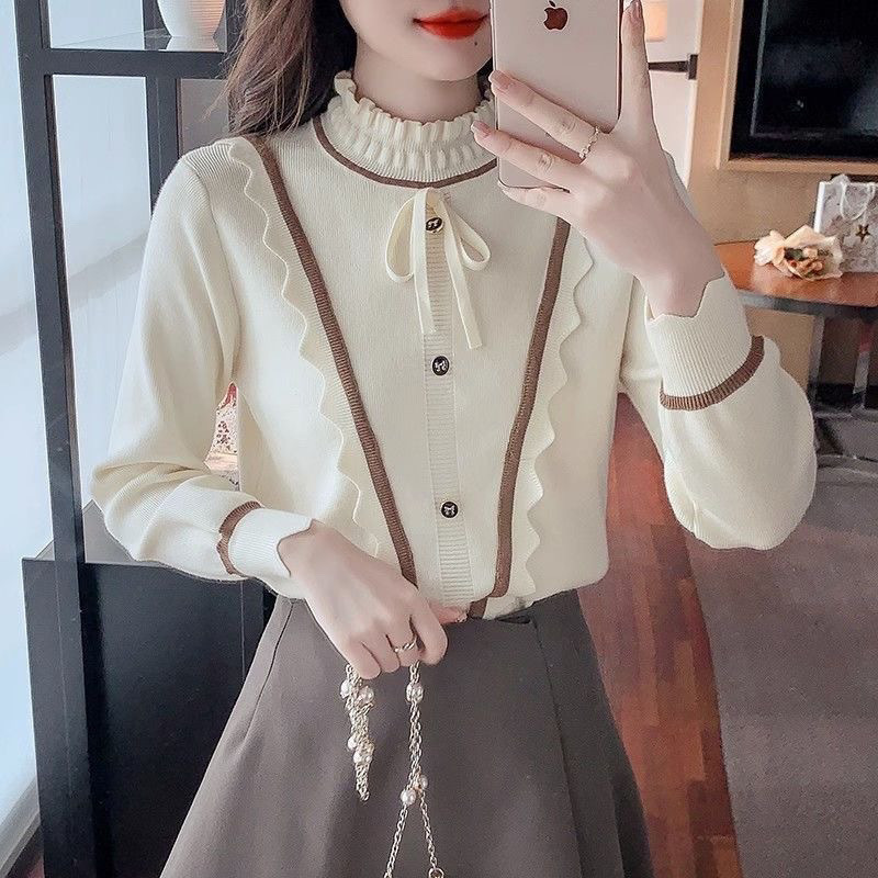 木の耳元の半分の高襟のニットの底のシャツの女性の秋冬の新型の甘い高級感の蝶結びのセーターの洋風の上着