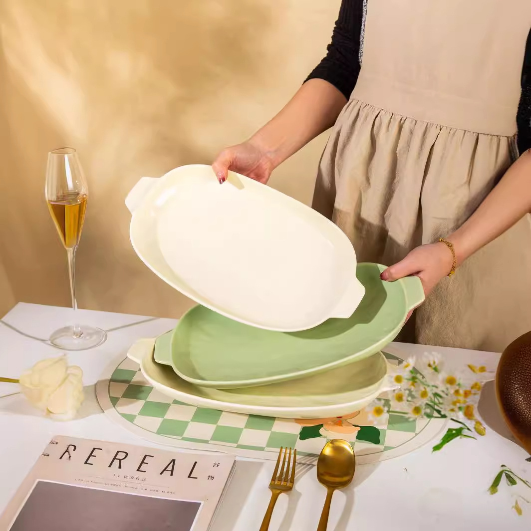 網紅高颜値クリーム風陶磁器皿家庭用単一蒸し魚皿釉薬下彩食皿両耳焼き皿食器