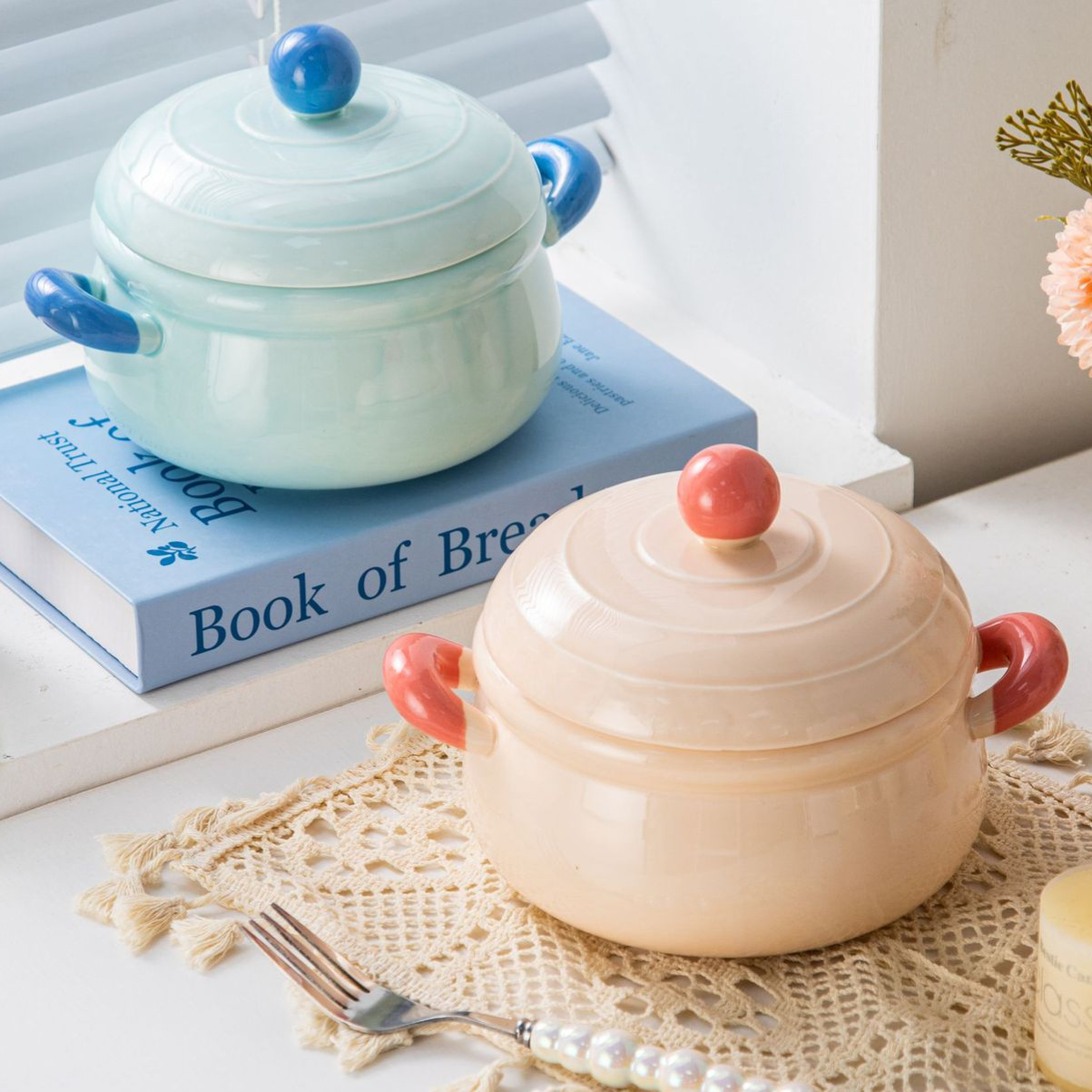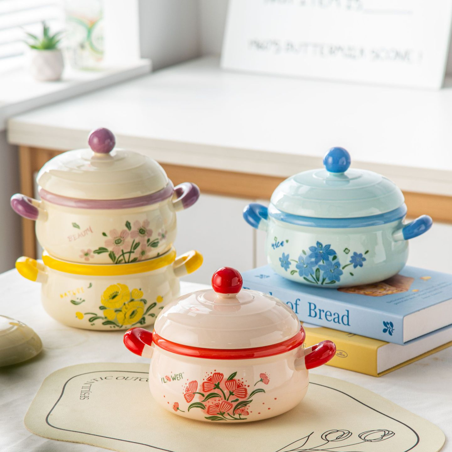 女の子向けのかわいいボウル、蓋付き高級インスタントラーメンボウル、陶器製ラーメンボウル、家庭用ラーメンボウル、両耳スープボウル、磁器ボウル