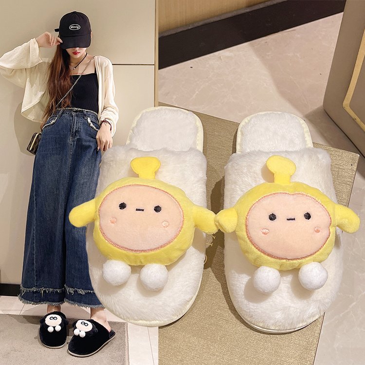かわいい漫画の綿のスリッパの女性の外着の2024秋冬のベルベットの厚い底の家の滑り止めの2つの大きい頭の毛のスリッパの女性