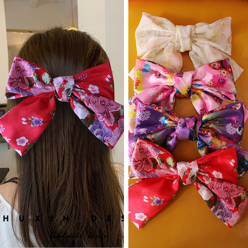 ネットの赤い蝶結びのヘアピンの甘い少女の髪の上に日本式の着物の後頭部の髪を挟みます。