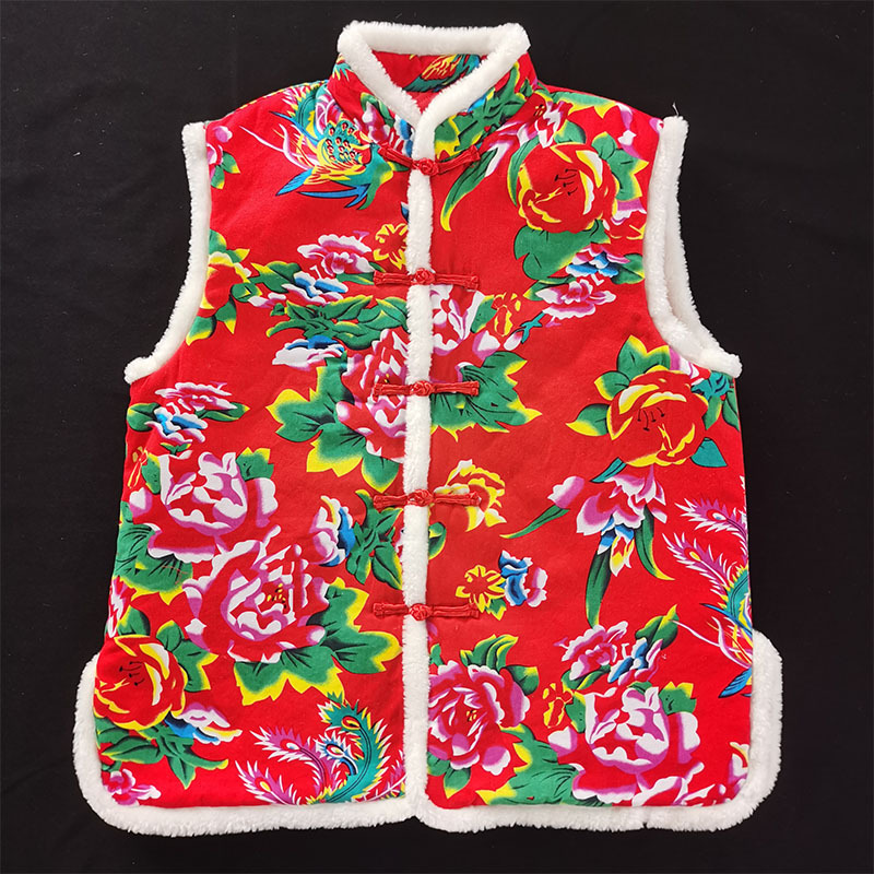 東北地方の花柄布地の演出用作業服、中国風唐装、イミテーションラビットファーのベスト、秋冬用短毛ベルベット綿入り保温ベスト