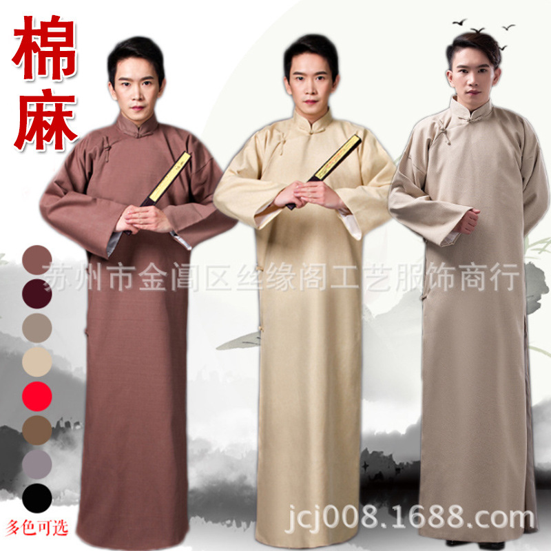 新型中国式の時代劇の男性の長いシャツの馬の上着の五四綿麻民国の服の先生の漫才の演出服の復古の長い服