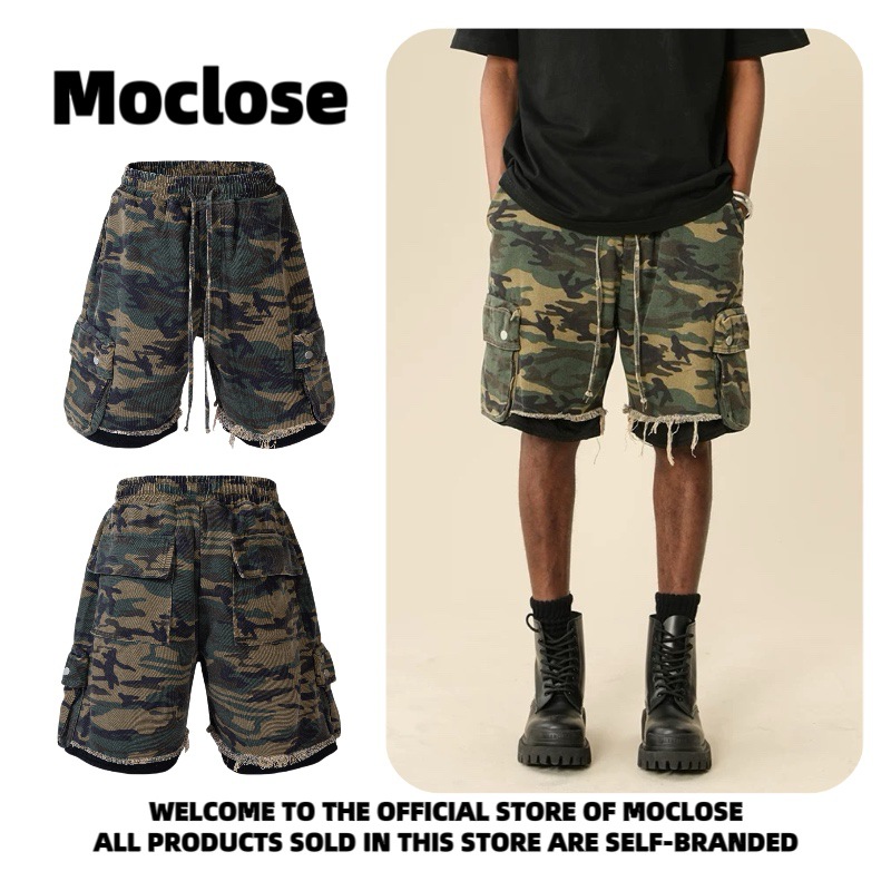 Moclose アメリカンストリート 春夏 カジュアル 迷彩 ダメージ加工 ローエッジシルエット メンズ レディース ゆったり ワークウェア クロップドショーツ