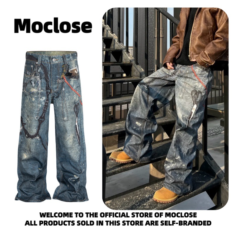 Moclose アメリカンストリートレトロ立体はさみデジタルプリント男性と女性のルーズストレートウォッシュデニムパンツ