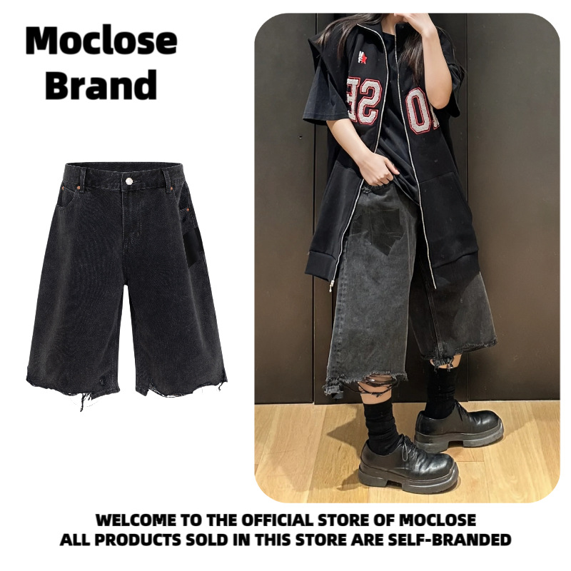 Moclose アメリカン ハイストリート 春夏 ダメージ加工 ローエッジ ブラック テープ ワイドレッグ クロップド デニム ショートパンツ 男女兼用
