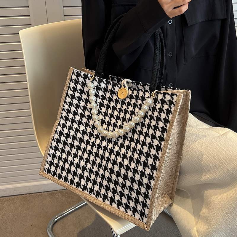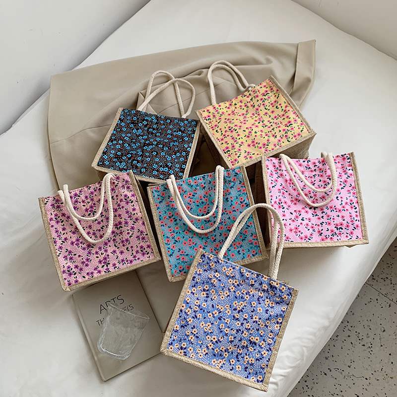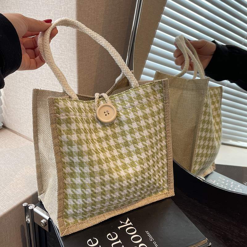 小清新ins手提げ亜麻弁当バッグ女2023夏の手に麻布バッグを持って麻のレジ袋をまねる