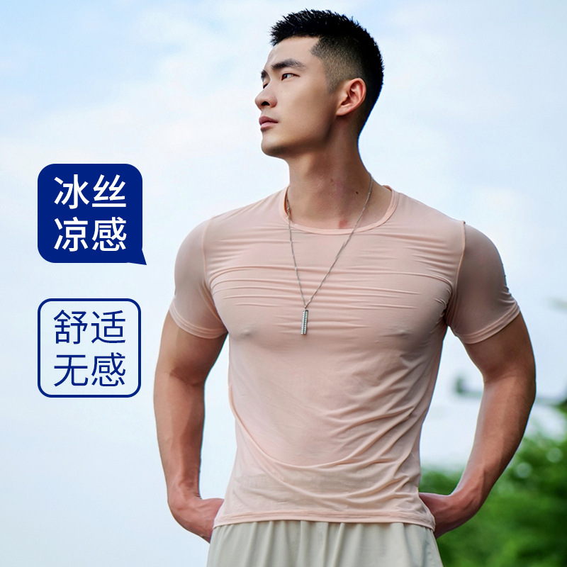 夏の氷糸半袖tシャツ男性超薄メッシュ通気速乾tシャツ男性運動フィットネス半袖新卸売り