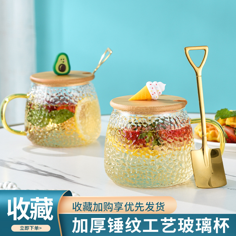 耐高温グラスマークミルクティーセラミックコップ大容量シンプル蓋付きハンマー模様日系かわいいins風
