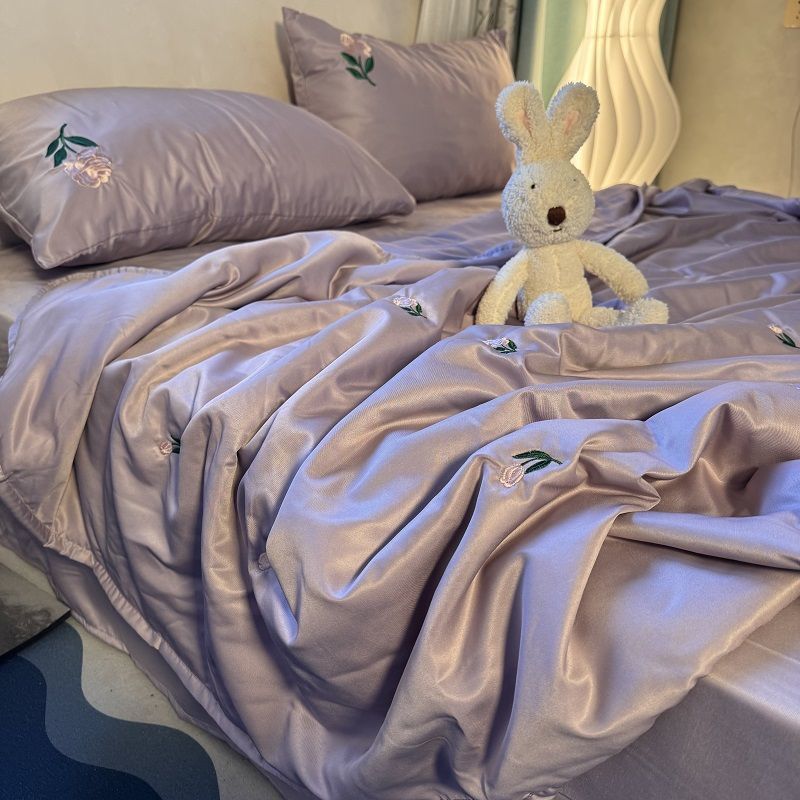 夏の両面の氷の糸の刺繍のエアコンは4セットの紫色のチューリップの2人の夏に寮の1人の薄い布団にされます。