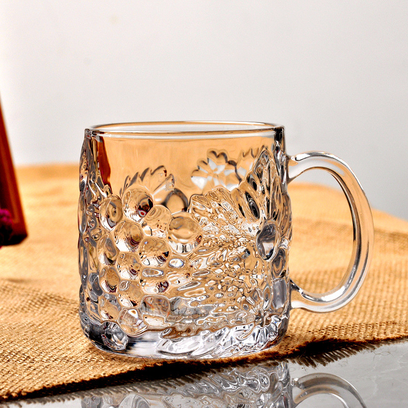 厚い取っ手付きガラスカップ家庭用耐熱カップビールグラス浮き彫りジュース飲料カップ大型ビールカップ