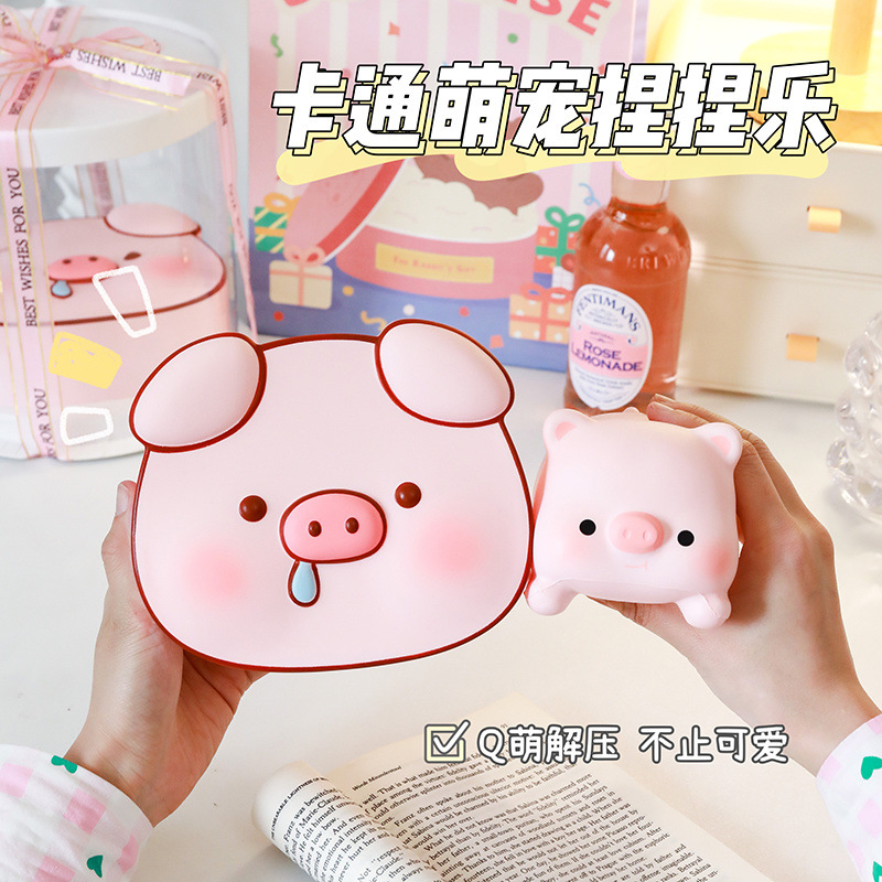 かわいいネットの赤いブタのブタのケーキはつまみます。ゆっくりと子供の女の子を弾きます。